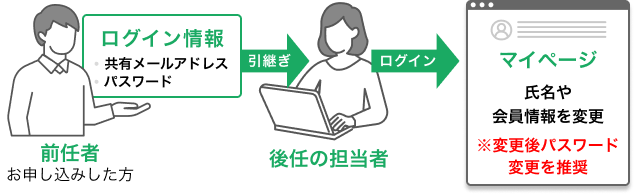 保健室や学校代表などの共有メールアドレスで登録している場合は、ログイン情報を共有して、引継いでください。