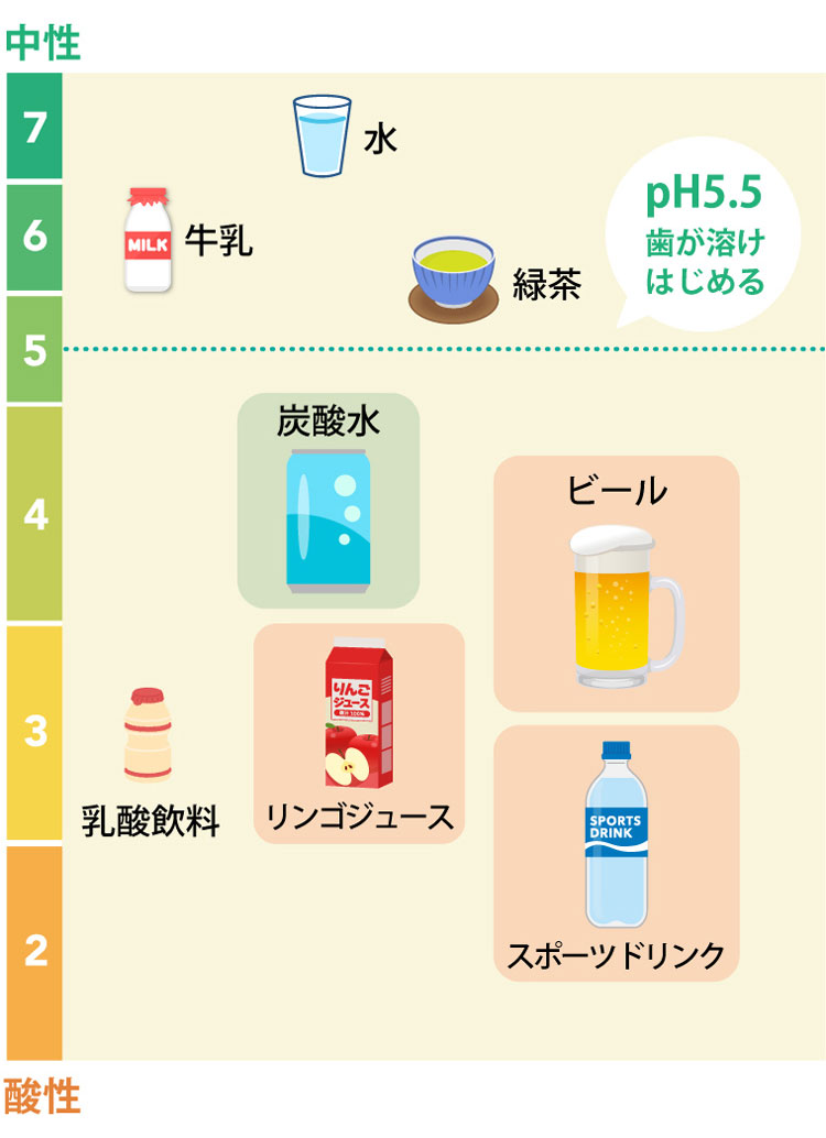 しかし酸性度の高い飲み物は、歯のエナメル質を溶かし、う蝕の原因になることがあります。