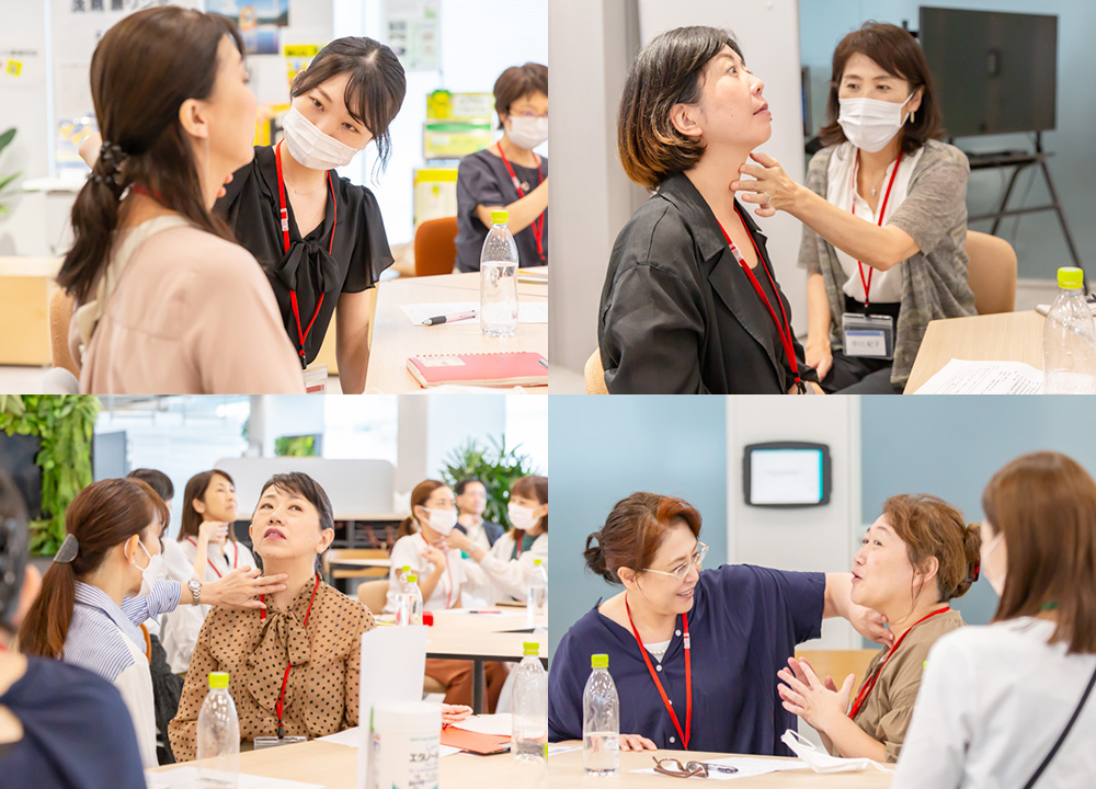 2人1組になり、反復唾液嚥下テスト(RSST)を実践しました。先生からは、女性はわかりにくい人が多いため、家族や友人の喉を触って慣れて行きましょう、とありました。